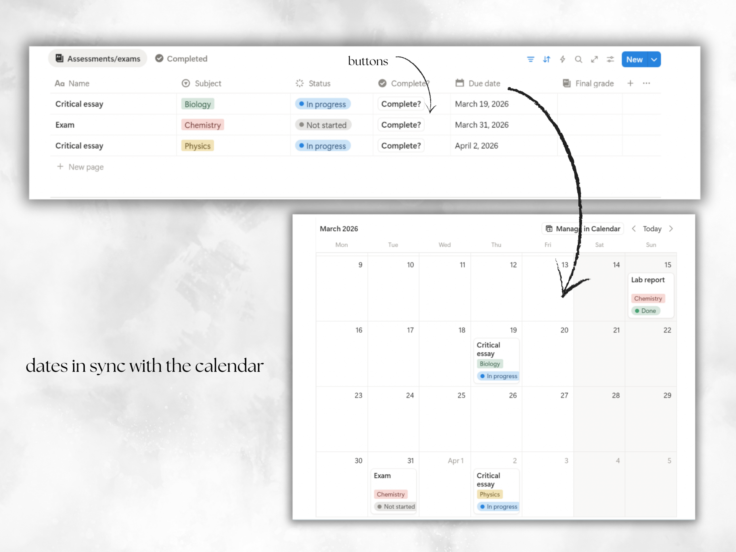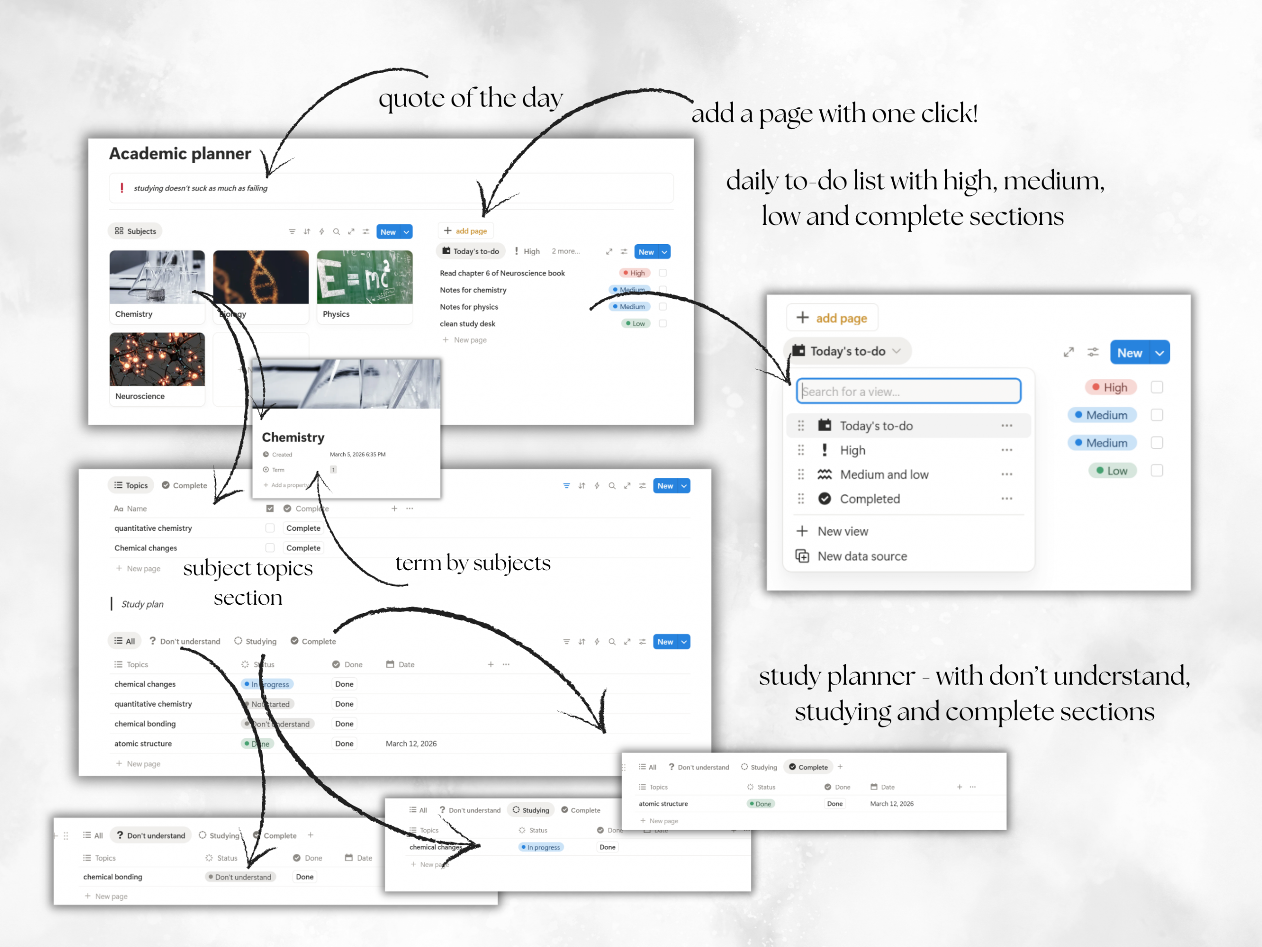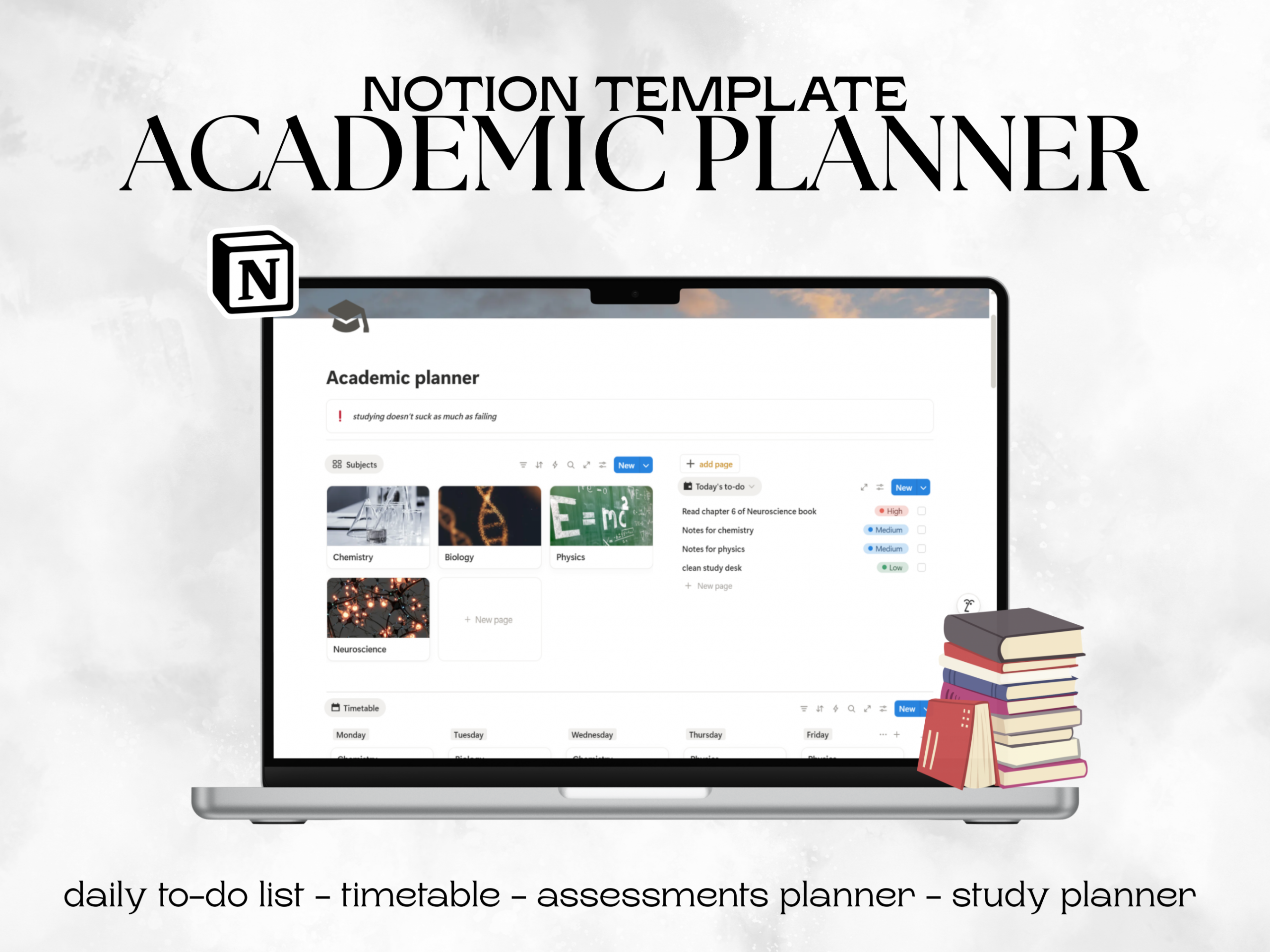 Stay organized, focused, and in control of your academic life with this academic notion template. Designed for students who want clarity and structure, this template helps you manage classes, assignments/exams, to-do lists and study plan in a clean, distraction-free workspace. Perfect for university, college, or high school students looking to boost productivity and stay ahead!