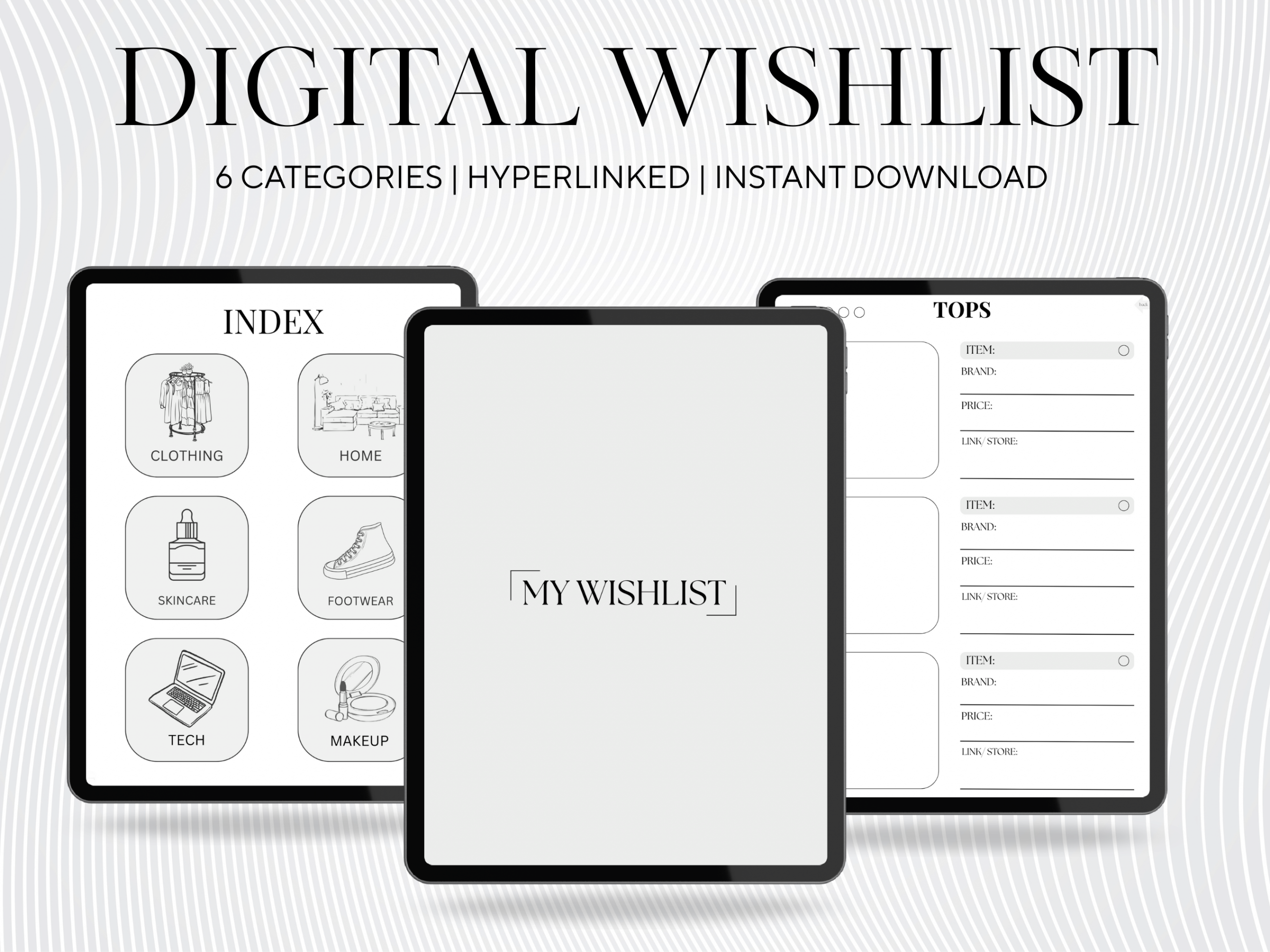 Keep track of everything you’ve been dreaming of with this Digital Wishlist Planner, designed to help you plan, organize, and prioritize your most wanted items. It has 6 categories: Clothes, Home, Skincare, Footwear, Tech and Makeup. Whether you’re saving for something special, planning future purchases, or just love organizing your wishlists by category, this planner is your go-to tool for keeping it all in one place. This planner is compatible with any pdf annotation apps such as goodnotes, notewise, xodo etc. Instant download! Start planning your wishlist today!